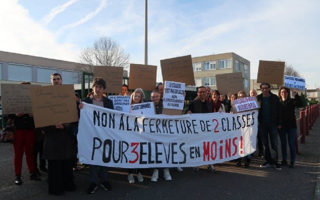 Le délégué SNFOLC de ce collège a mobilisé ses collègues et une bonne dizaine de parents pour dénoncer la dotation du rectorat et faire valoir leurs revendications : « L’an dernier, on nous avait annoncé 6 élèves en plus, ça nous faisait 4 classes de sixième à 27 élèves alors qu’elles devaient être limitées à 24. Pour la prochaine rentrée, il n’y aura que 3 classes de sixième, alors les élèves seront 29 par classe. Dans la dotation horaire globale (DHG), on voit que 29 heures 30 disparaissent et il [le rectorat] ferme deux classes sur l’ensemble de l’établissement ».